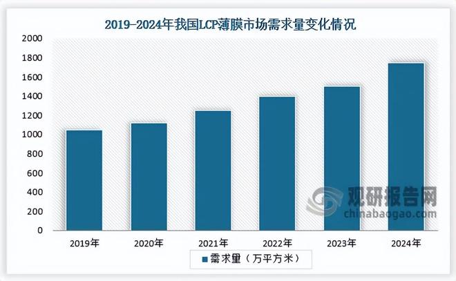 需求量来看,2019-2024年我国LCP薄膜市场需求量呈稳步增长。2024年我国LCP薄膜市场需求量增长至1744万平方米。