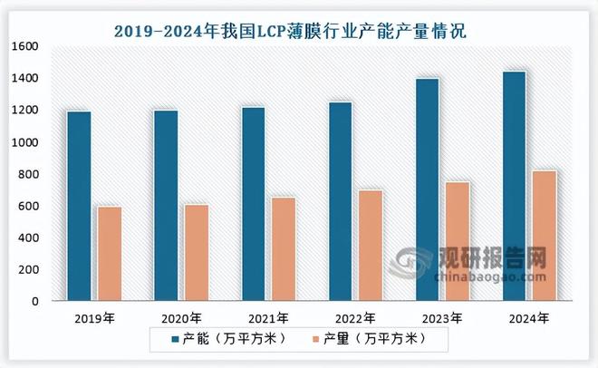 产能产量来看,随着下游电子企业对LCP薄膜需求大幅增长,国内企业纷纷加大投入,扩建生产线,提升技术水平,推动LCP薄膜产业产能持续扩张。2024年我国LCP薄膜产能约为1440万平方,产量约为821万平方米。