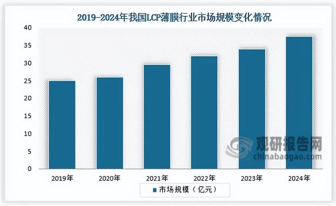 市场规模来看,近六年我国LCP薄膜行业市场规模呈增长走势。2024年我国LCP薄膜行业市场规模达到37.50亿元。