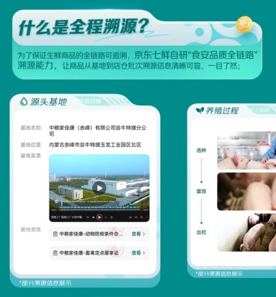 目前,京东七鲜App与小程序已上线数十款支持“全程溯源”的生鲜商品,涵盖肉类、海鲜、蔬菜、水果等多个品类。以180天白猪冰鲜猪肋排、深海野游大黄鱼、富硒菠菜苗、北京庞各庄头茬小西瓜等为例,在源头管控环节,可以追溯到种植/养殖基地具置、各类资质证明、出厂检测报告;物流运输环节,可以实现运输方式与运输环境温度监测记录;入库仓储部分,可以实现入库质检结果、检测报告的系统化留存;城市配送、门店销售等环节则实现了商品流、温度、进店检测报告等全环节记录及监控。六大流通环节信息完整串联,构成真正意义上的“端到端”安心保障。