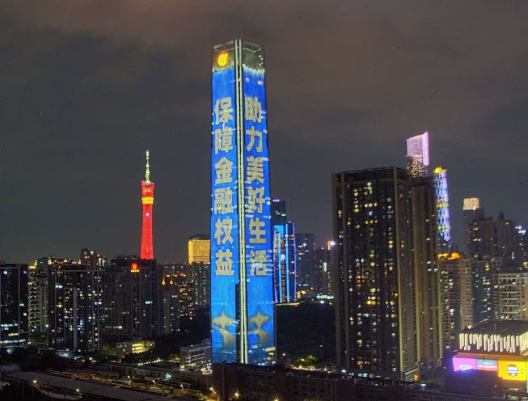 尤为引人注目的是,“保障金融权益助力美好生活”的主题标语在广州CBD地标性建筑上通过灯光秀形式被点亮,不仅成为城市夜景中的一道亮丽风景线,更引发了广泛的社会关注和讨论,极大地提升了活动的公众影响力。